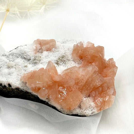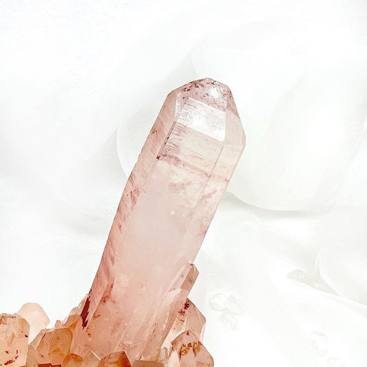 稀有橘子水晶冰透粉紅皮赤鐵礦骨幹水晶簇