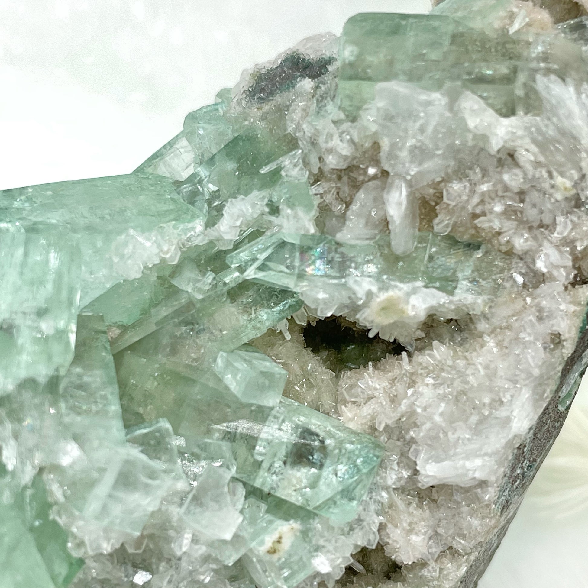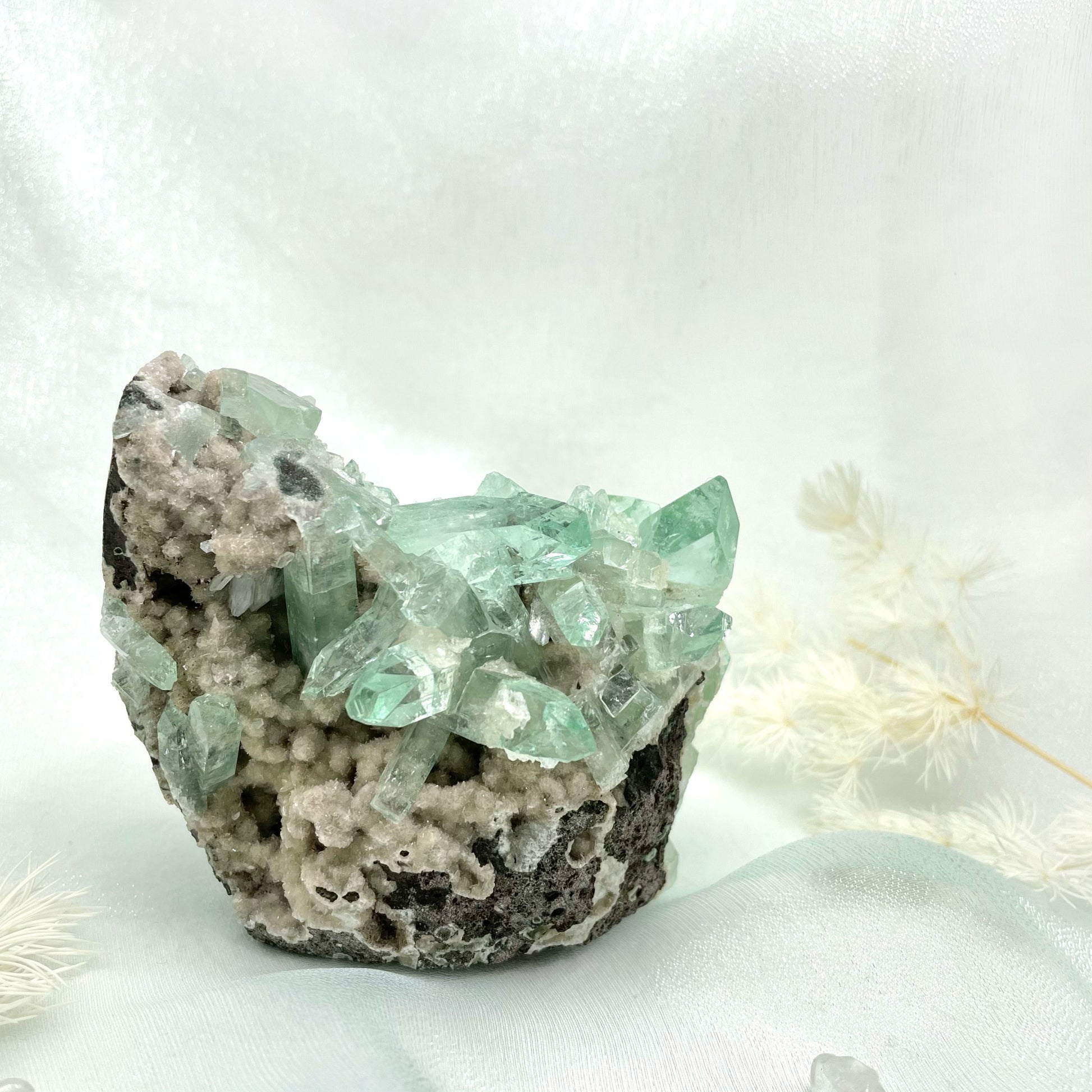 冰透夢幻的綠鑽石💎魚眼,配上晶花狀半透片沸石共生✨如初春雪花悄悄融化的狀態